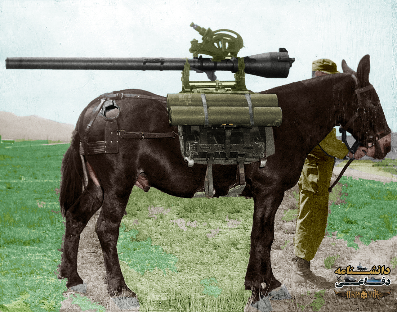 در این تصویر یک راس قاطر حامل یک قبضه سلاح بدون لگد کالیبر 57 مم است که آمریکا در طول جنگهای جهانی دوم و کره استفاده میکرد.